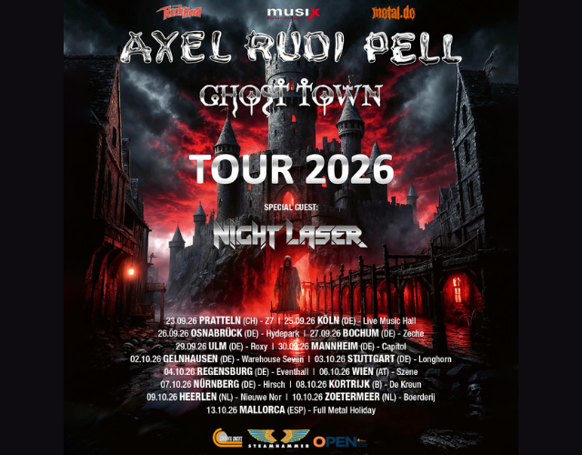 Für die Musik des Bochumer Gitarristen, Komponisten und Bandleaders Axel Rudi Pell braucht man weder Lexikon noch Navigationsgerät. Denn das, was vermutlich auf nahezu alle erfolgreichen Musiker zutrifft, gilt auch für Pell: Seine Songs tragen eine für ihn typische, jederzeit charakteristische Handschrift, ein Hybrid aus kraftvollen Gitarrenriffs und eingängigen Melodien sowie dem Fundament einer bravourös agierenden Band um den amerikanischen Sänger Johnny Gioeli, Ex- Rainbow-Drummer Bobby Rondinelli, Bassist Volker Krawczak und Keyboarder Ferdy Doernberg. Und obwohl Pell seine Fans mit dieser signifikanten Mischung bereits seit weit mehr als 35 (!) Jahren begeistert, findet man auf seinen Alben immer wieder raffinierte Überraschungen oder bemerkenswerte Kooperationen. Auch auf seiner aktuellen Studioscheibe ‚Ghost Town‘ steht fest: Axel Rudi Pell vergrößert die lange Liste großartiger Songs seiner Karriere um weitere elf Exponate. Und diese wird er im Rahmen der großen „Ghost Town Tour 2026“ live vorstellen.